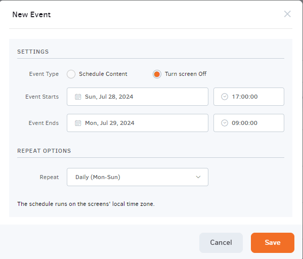 In addition to customizing your content display, the schedule feature also allows you to set specific hours for your screens to be turned off. This can help you save on your electric bill and is quickly done using the special predefined “Turned Off” feature.