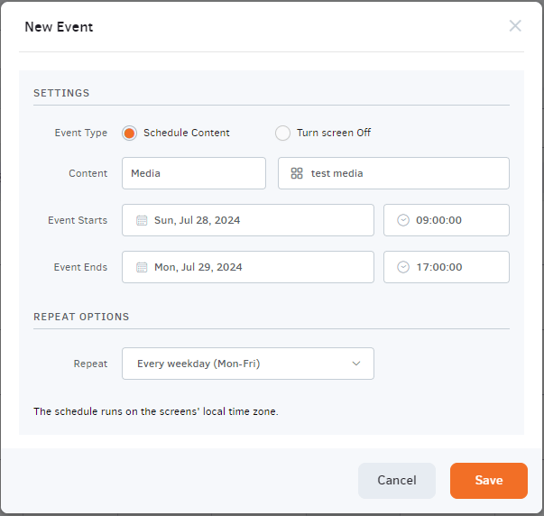 In this example we want to display the test media daily on weekdays from 09:00 till 17:00 and the rest hours outside the schedule we want the player to turn off and we will set as default content to turn the screen off.