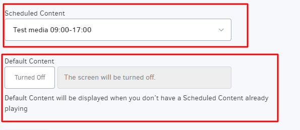 You can create a schedule to display your content on a specific time frame and set a default content to display other content or turn off the screen the rest hours outside the time frame of your schedule. Schedules have priority over the default content and when a schedule and a default content is assigned to the player, the player will display the schedule content on the time frame that you have set for the schedule and the rest of the time the player will switch and display the default content.