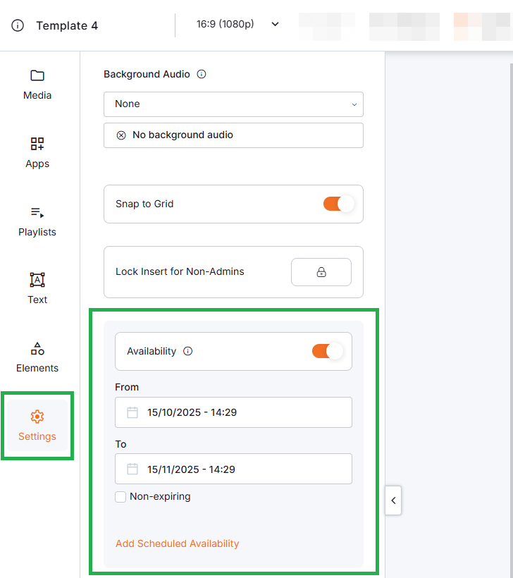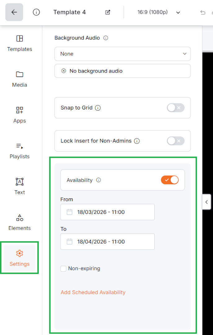 Advanced settings in Yodeck’s Layout Editor help you take your layouts beyond static designs. They allow you to automate when content plays, control what happens after it expires, and enhance viewer experience with features like background audio.