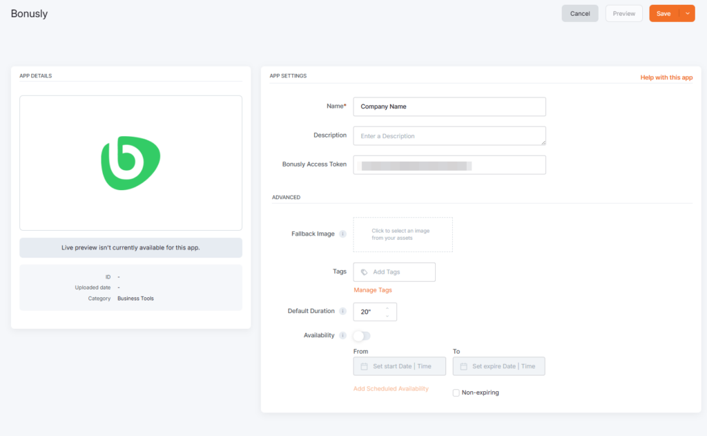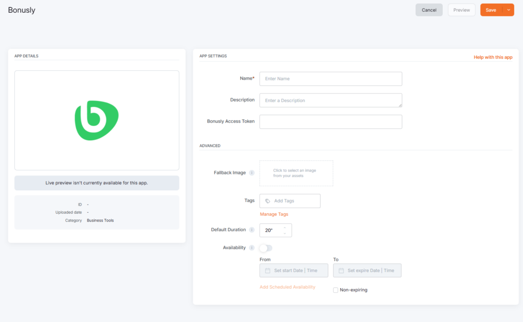 Click on the Bonusly App within your App Gallery to add it, and fill in the app details as follows: