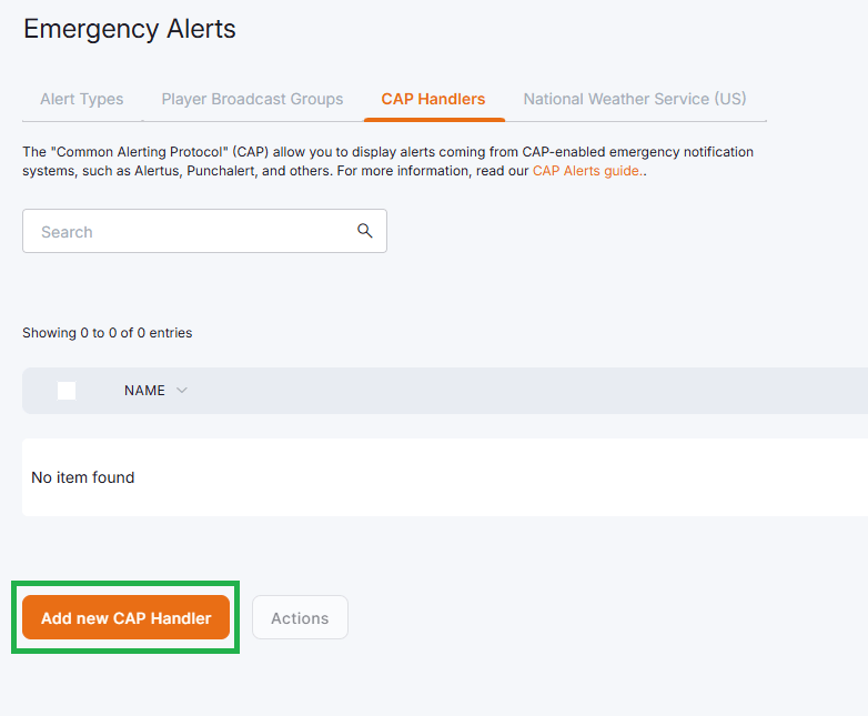 Secondly, go to the Emergency Alerts and click the CAP Handlers tab, as shown below.