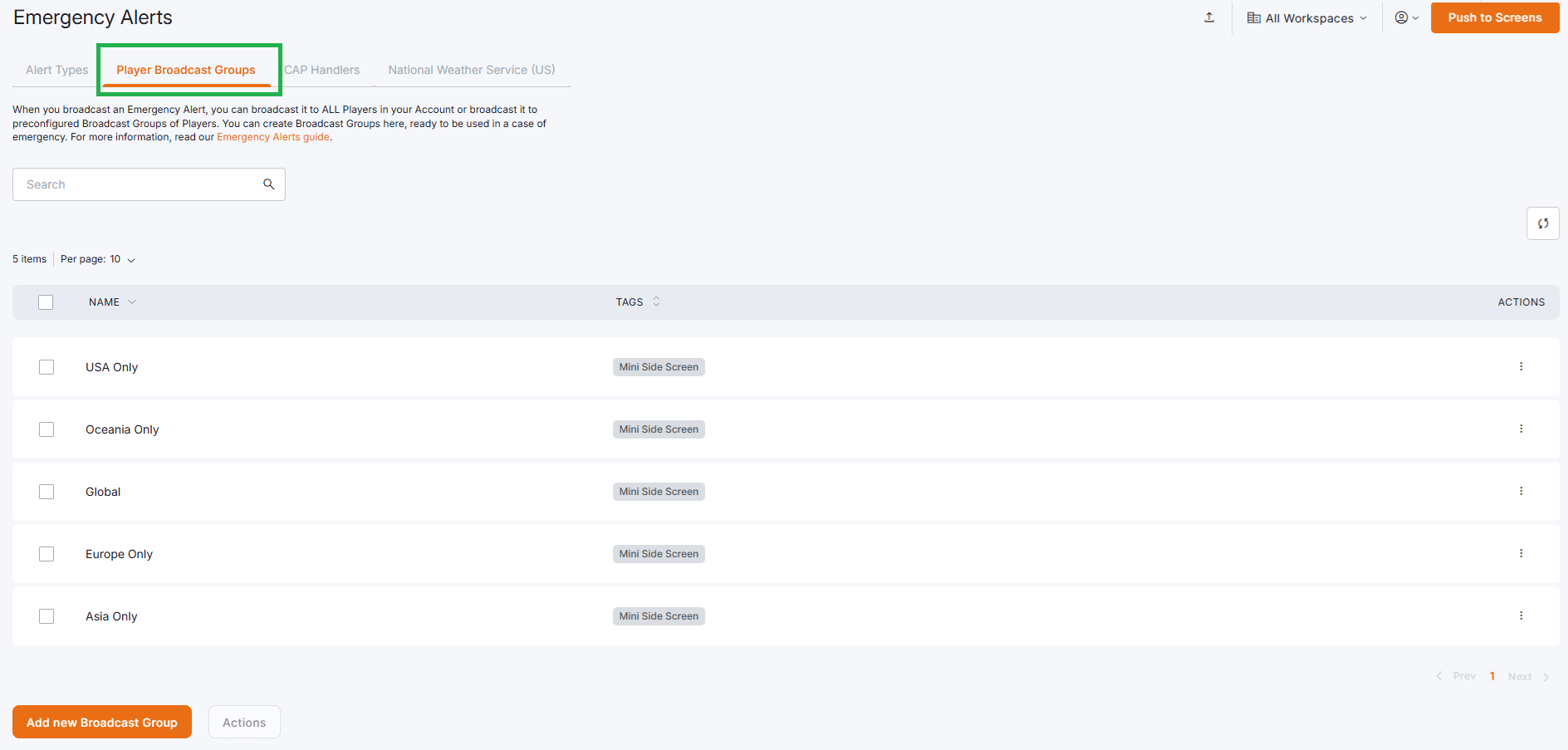 [Enteprise Plan only] Select the specific Workspace(s) that you like, and all the player(s) nested on that Workspace(s) will display your CAP alert messages. Leave empty for no filtering. Standard & Pro Plans If you are on the Standard or the Pro plan, all players will be selected instead, and this field will not appear on that form.