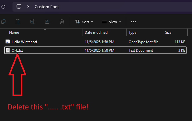 'YourFontFile'.otfwith the font’s true file name.- Example: “Hello Winter.otf”