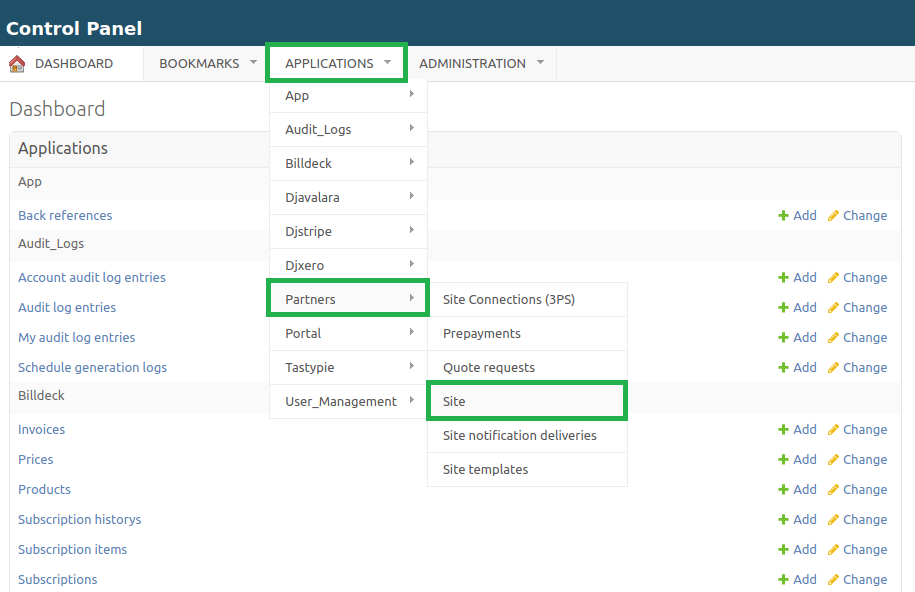 This action opens the area where you can manage settings and service availability for partner sites.