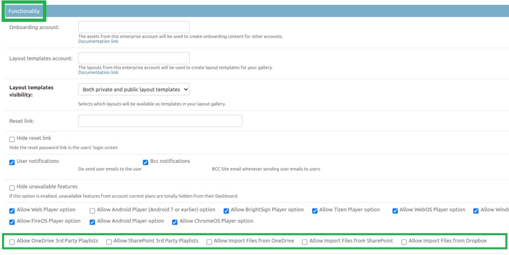 For example, enabling Allow OneDrive 3rd Party Playlists does not also enable Allow Import Files from OneDrive. If you want both options available, you need to enable both settings.