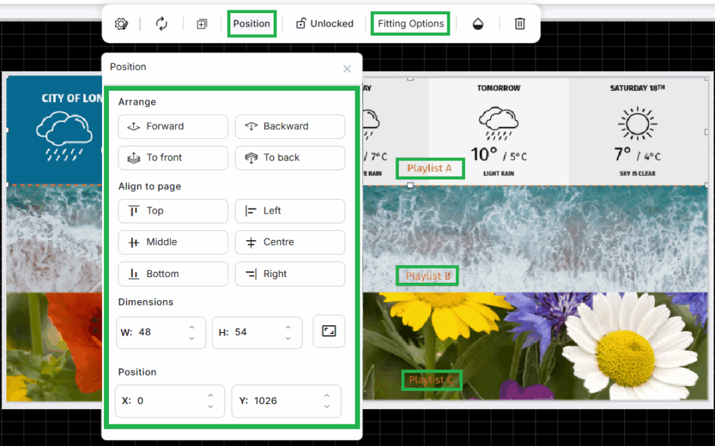 Finally, we create a Layout and place it on top of Playlist A, in the middle of Playlist B, and at the bottom of Playlist C. Use the pixel controls on the right to align properly all 3 Playlists.