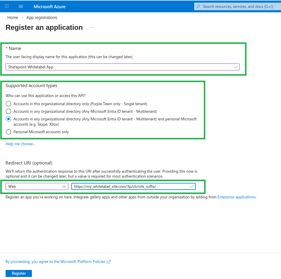 - Fill in the basic facts: Name, Supported account types, Redirect URI (All points of interest are marked with green.) The Name value must be set as our App name. Then you can click on the