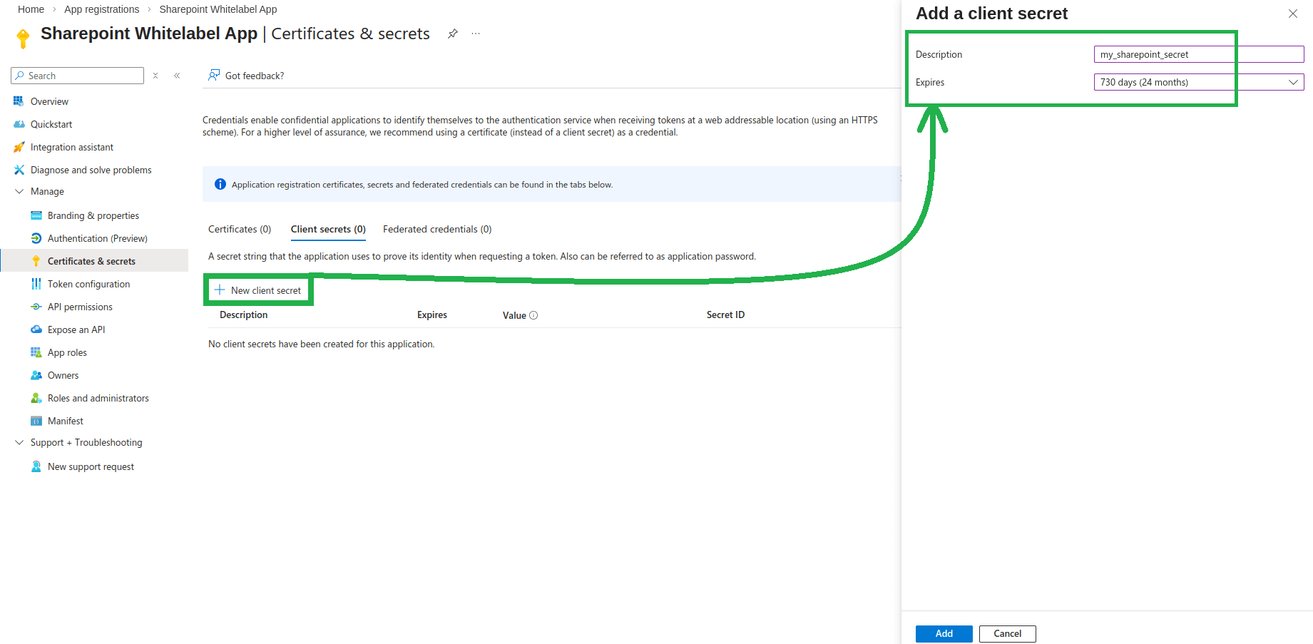 Enter the Certificates & Secrets section and click New client secret. Enter a Description and select when it Expires, click Add.