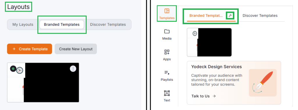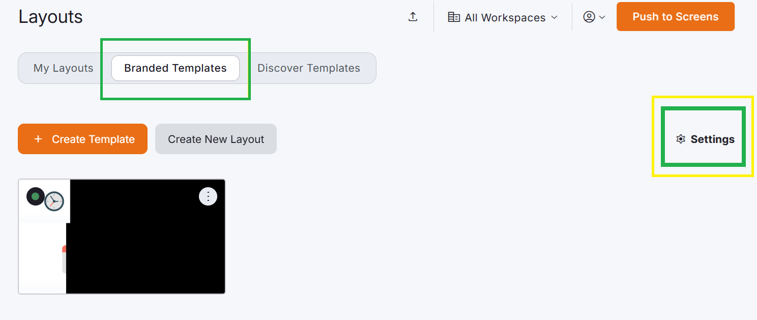 Switch to the Branded Templates tab inside the Layout view page to view your organization’s shared templates. These templates help teams maintain consistent branding and layout structure across multiple screens and locations.