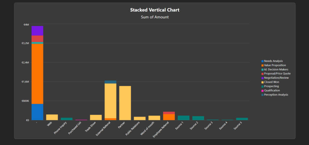 For stacked charts, Yodeck uses the first grouping as the main category and the second grouping as the stacked breakdown. If you want a different result, change the grouping order in the Salesforce report itself.