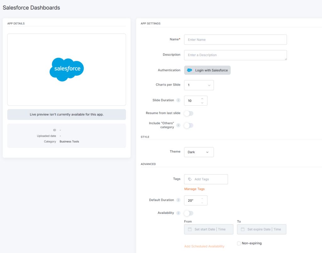 To display Salesforce app content on your Yodeck screens, click on the Salesforce app within your app gallery to set it up, and complete the app details as follows: