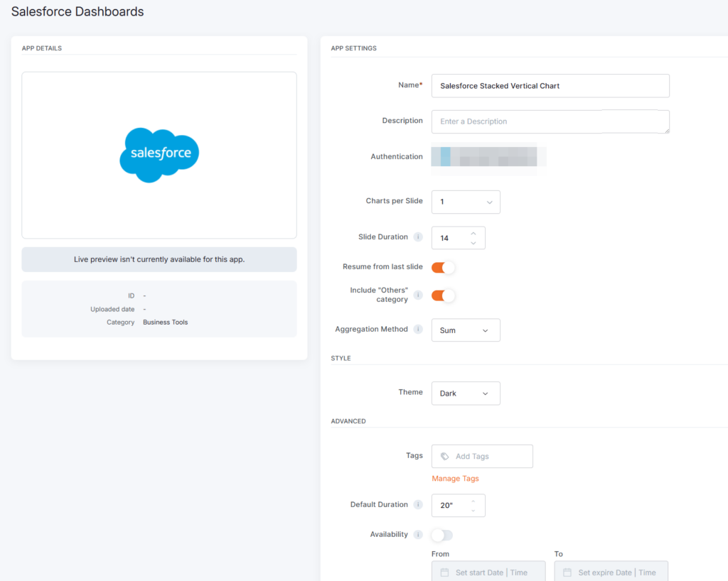 ℹ️Yodeck will verify the credentials with your Salesforce instance. - Once the authentication succeeds, you can select a Salesforce dashboard and choose which supported charts to include in your app from the available Salesforce dashboards. By default, all charts in the selected dashboard are included. You can deselect any charts you do not want to show on screen.