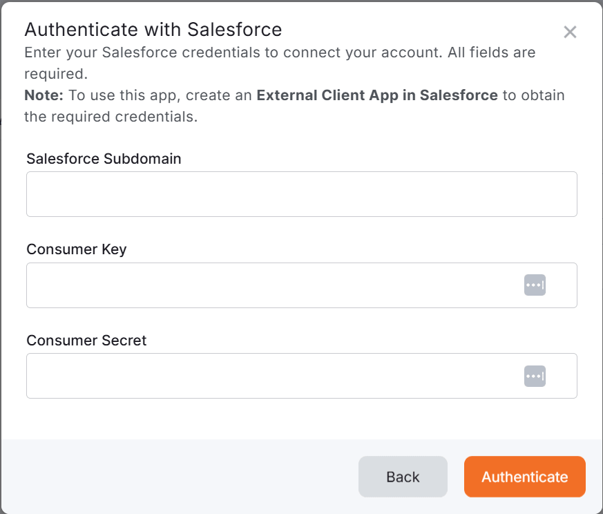 To use the Salesforce app, you need to first create an External Client App in Salesforce and then enter its credentials in Yodeck.