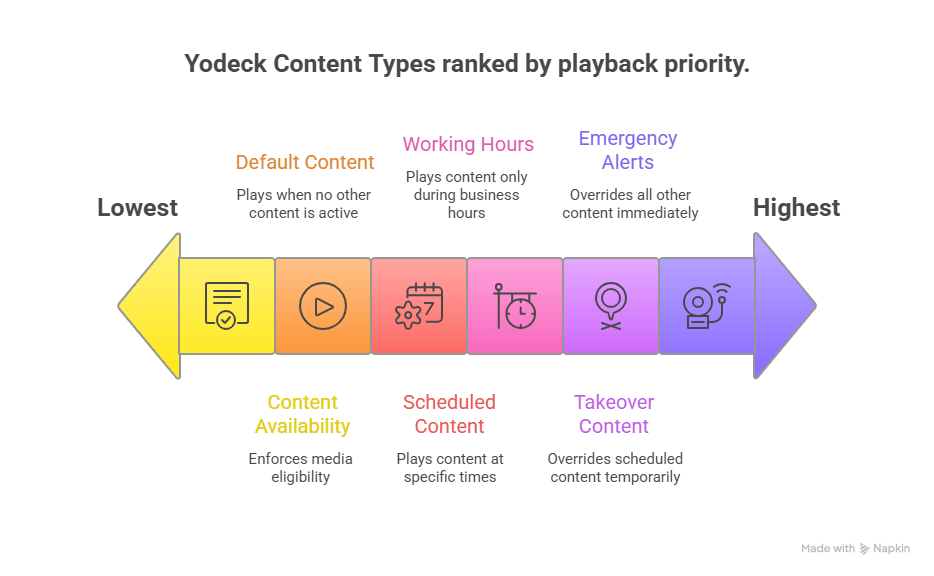 Yodeck organizes screen playback logic into six Content Types, each with a defined priority level. When more than one rule applies, the higher-priority Content Type overrides the lower one.