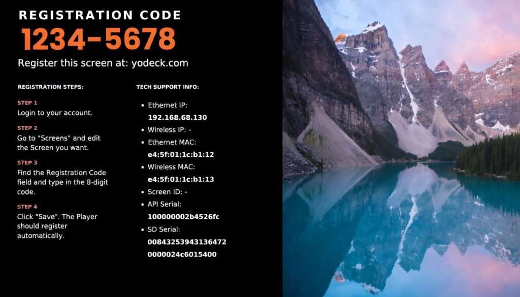 When you set up a new player in Yodeck, you will see a registration code on your screen. This code links your device to your Yodeck account, so you can register it and start managing it from the portal. In this article, we explain what the registration code is, where to find it, and how to use it to complete setup successfully.