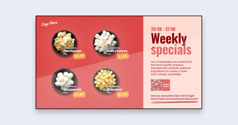 Your checkout area is your last chance to make an impression. Position screens where lines naturally form, keep messages short with large, easy-to-read text, and add interactivity with QR codes that share coupons, recipes, or loyalty sign-ups right from the screen.